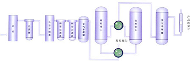 變壓附吸附制氮原理 變壓吸附制氮采用優(yōu)質(zhì)碳分子篩為吸附劑.一定壓力下,根據(jù)空氣中氧分子的擴散速率更大于氮氣分子的擴散速率及碳分篩固有的物理特性.利用氮氣分子.氧分子在通過碳分子篩時吸附量的差異,通過可變程序控制氣動閥的啟.閉,達到A、B兩塔交替循環(huán).加壓吸附.減壓脫附的過程,完成氧、氮分離、得到所需純度的氮氣。 PSA制氮機工藝流程圖 ![]() PSA制氮機特點 提供較大商業(yè)價值 1、分子篩裝填與壓緊均采用專業(yè)方式在專業(yè)環(huán)境下完成密度較大,效率較高。 2、流程與結(jié)構(gòu)的設(shè)計較優(yōu),系統(tǒng)得以發(fā)揮較大潛力。 靠性高: A.采用一百萬次頻繁切換無故障的專用閥門,保障系統(tǒng)的穩(wěn)定運行。 B.系統(tǒng)設(shè)計更加合理,設(shè)備更安全。使用方便: A.氮氣純度.流量可自動記錄,方便查找任一時段的工作狀態(tài). 。 B.系統(tǒng)全自動運行,全過程可實現(xiàn)無人守值。 | |